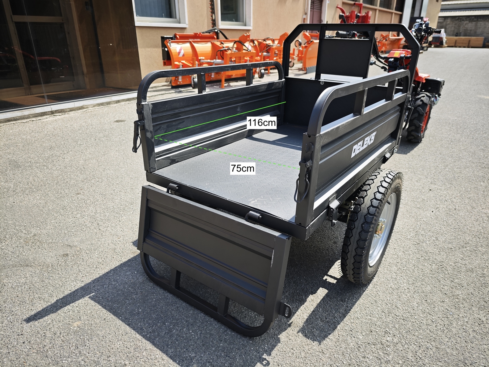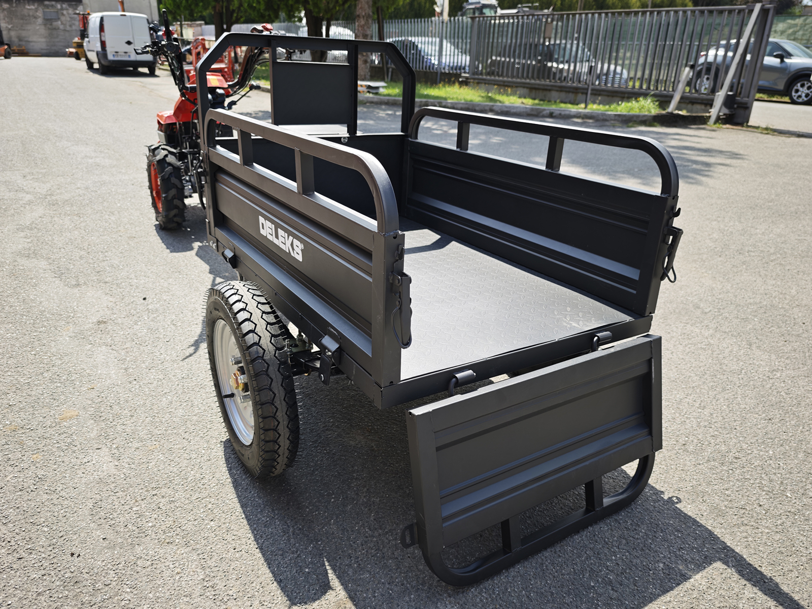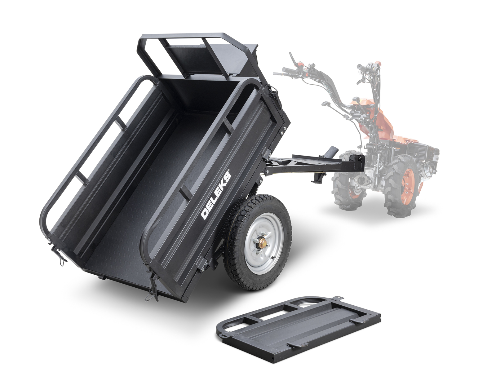 DELEKS® Tipping Trailer for two-wheel tractor. Compatible with BCS, Ferrari, and Pasquali walking tractors.