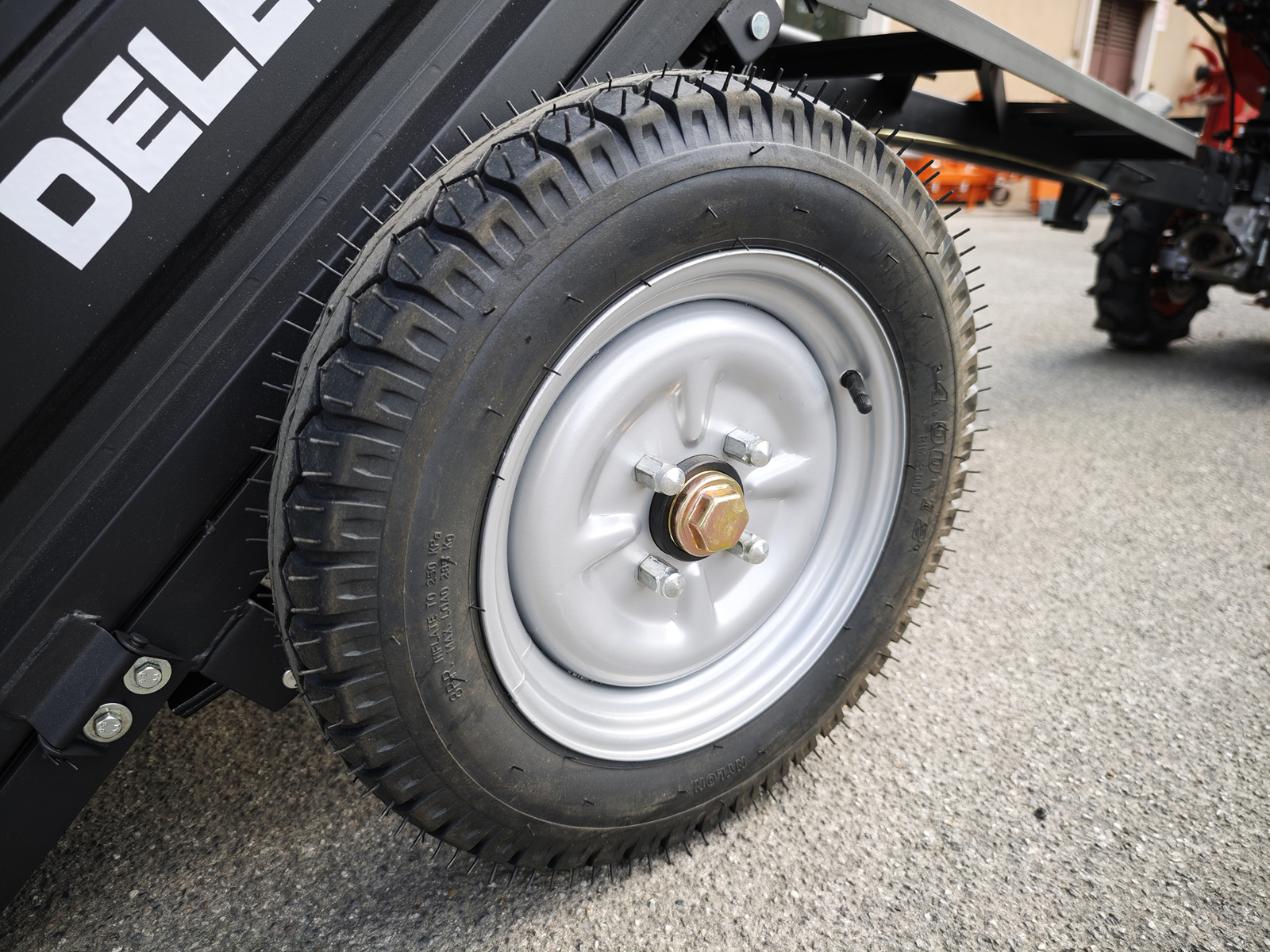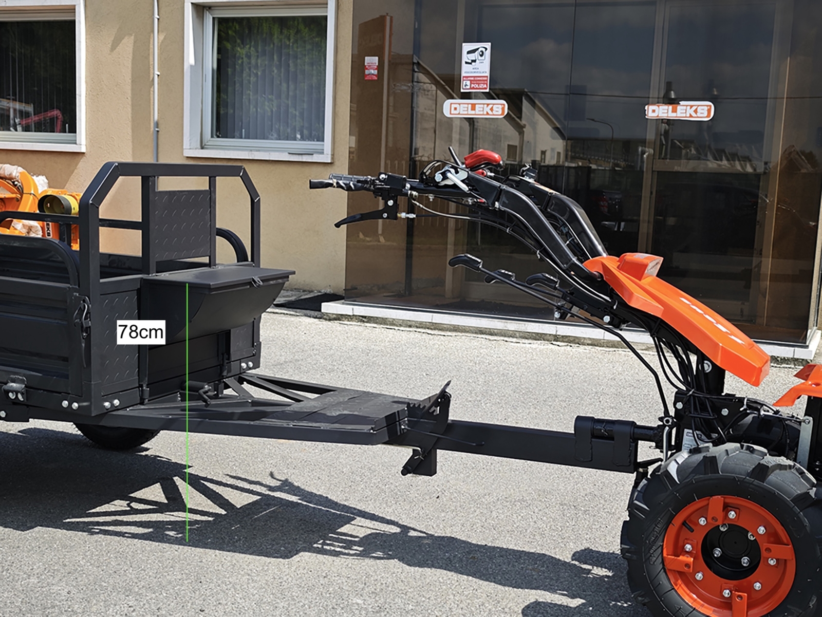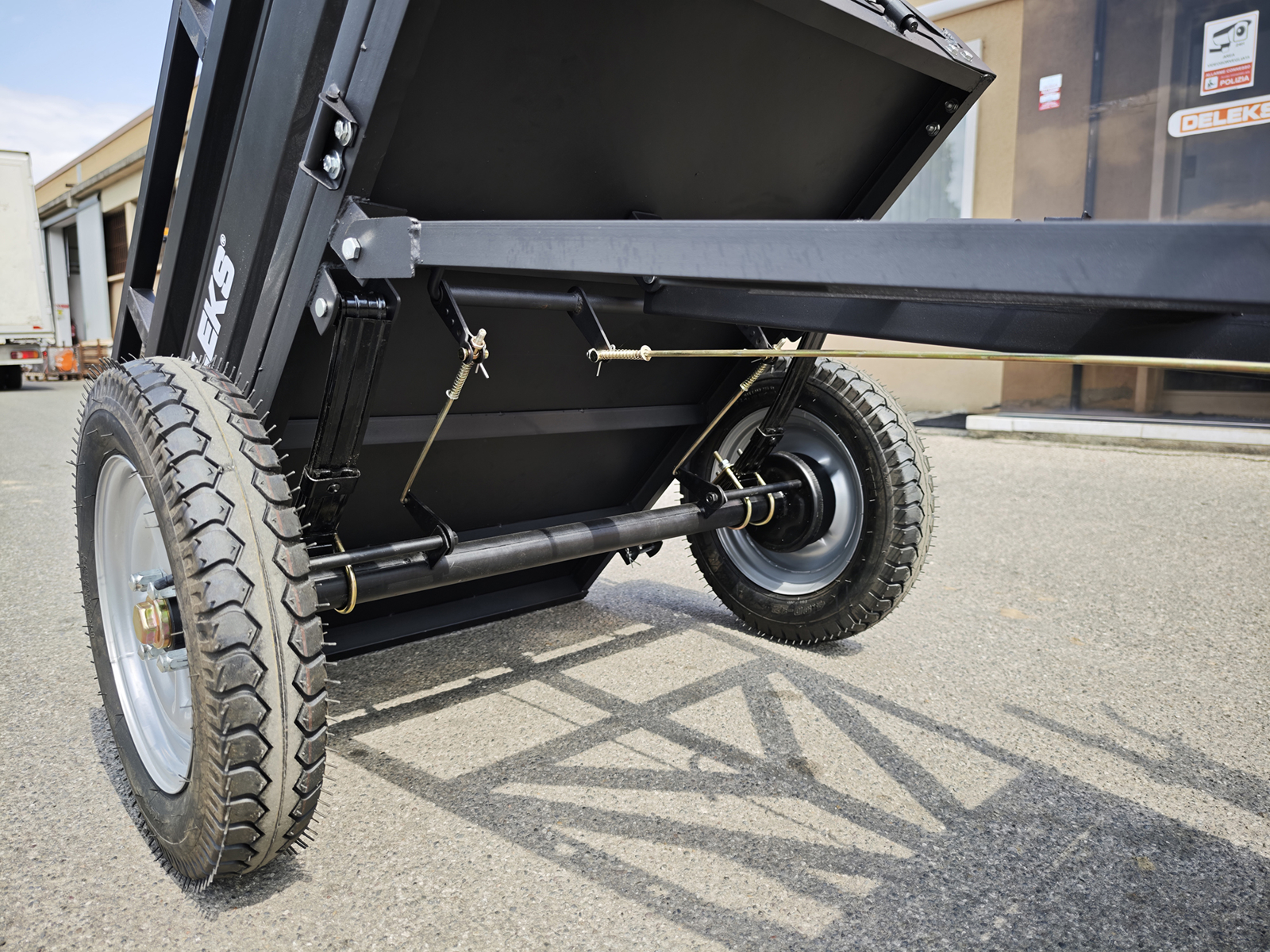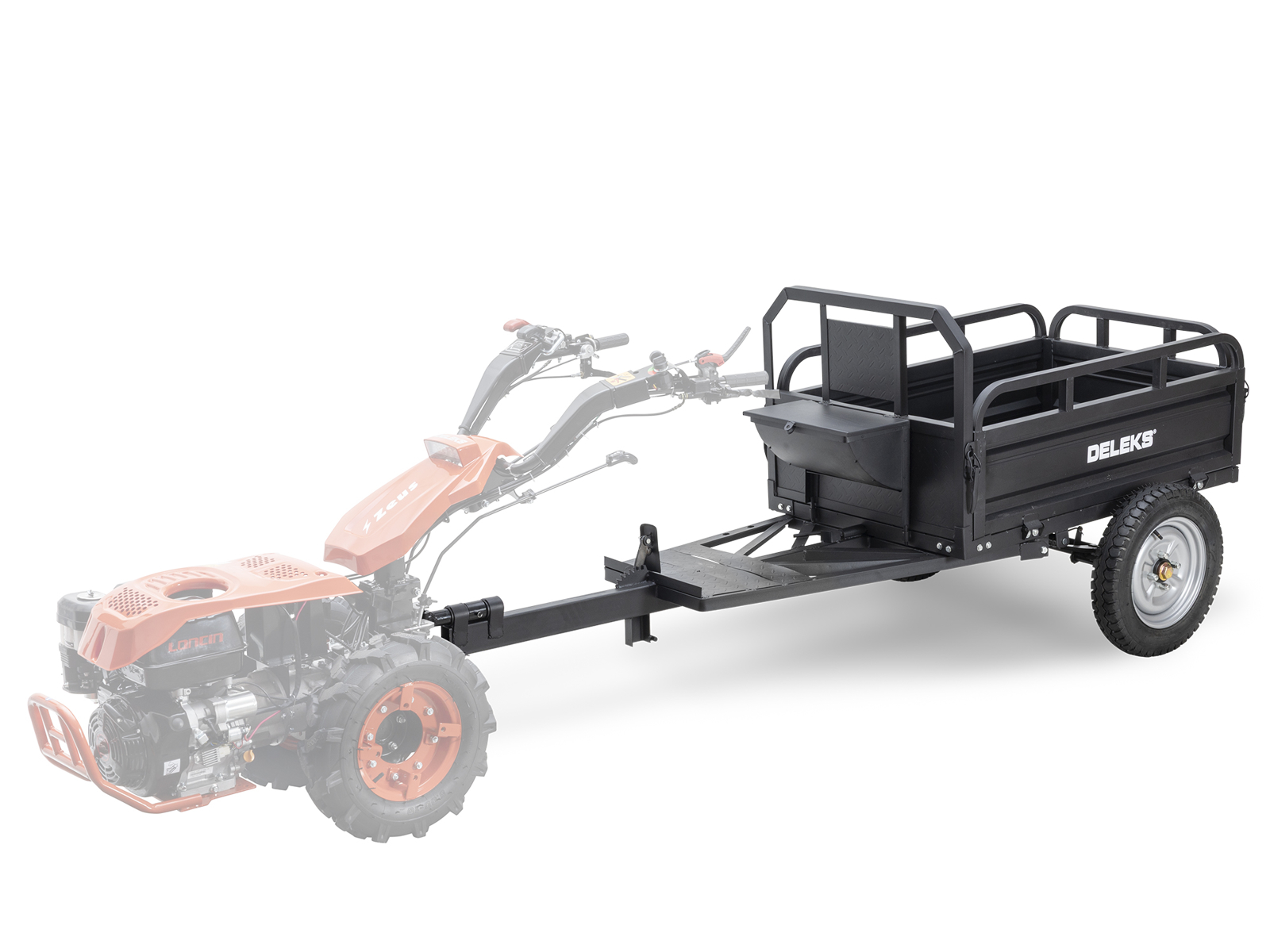 DELEKS® Tipping Trailer for two-wheel tractor. Compatible with BCS, Ferrari, and Pasquali walking tractors.