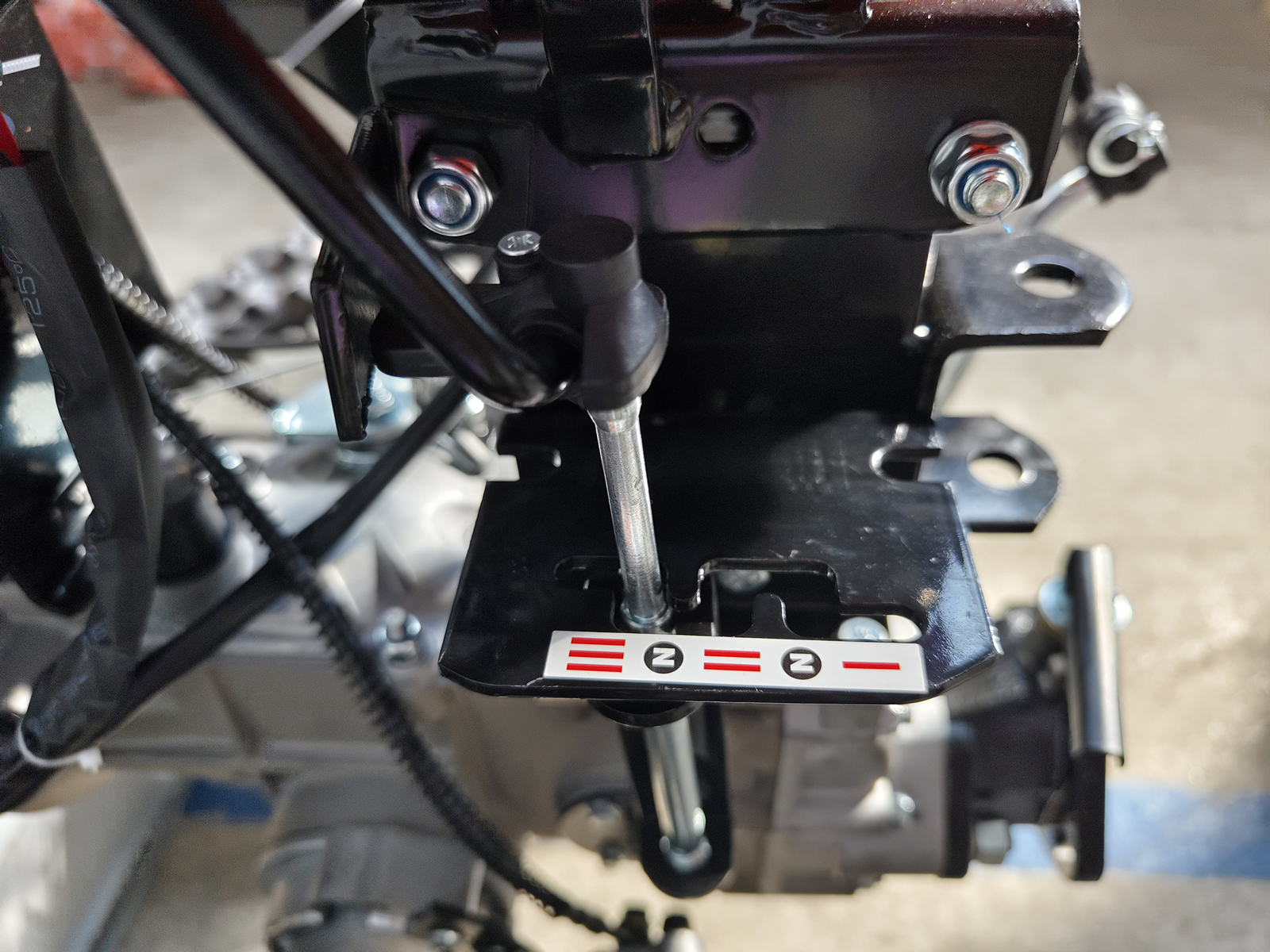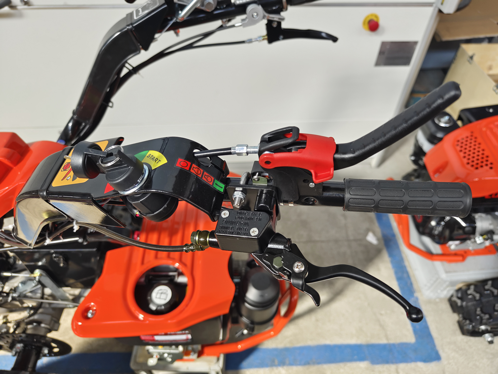 - 180° reversible so that front implements (such as the mulcher) and rear implements (such as the hoe) can be attached to the motor cultivator.