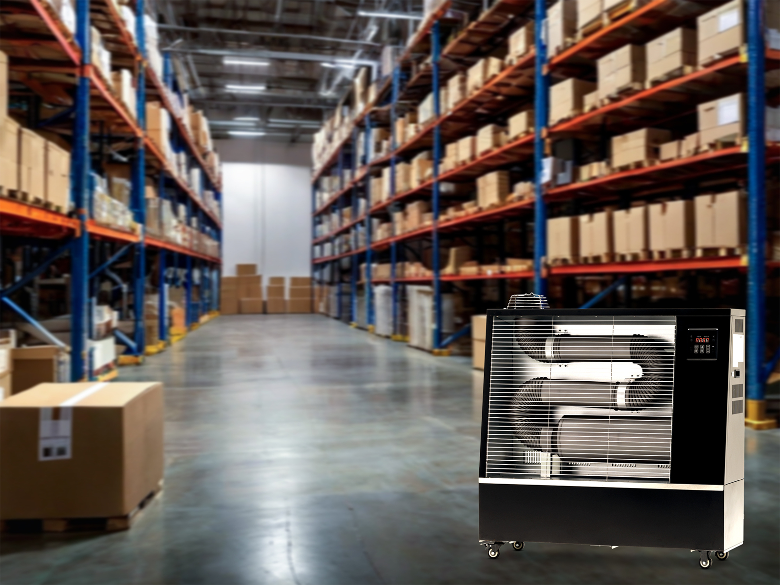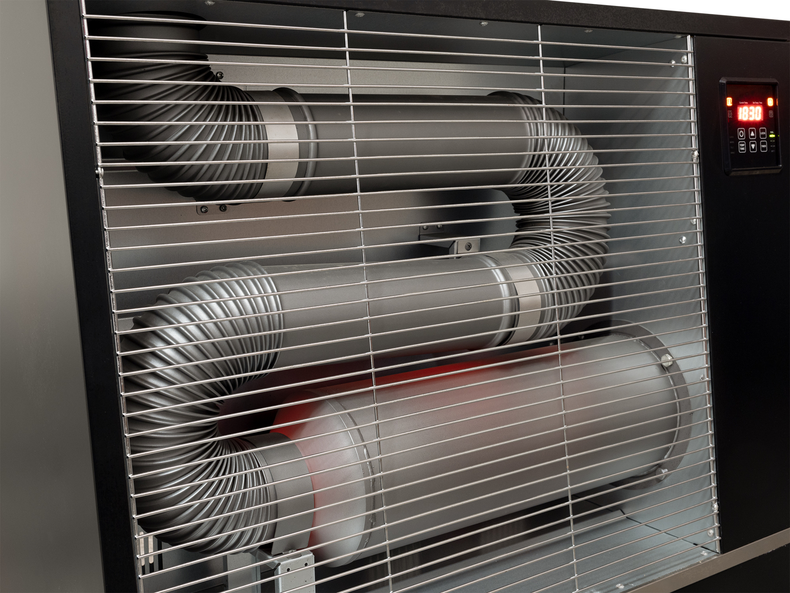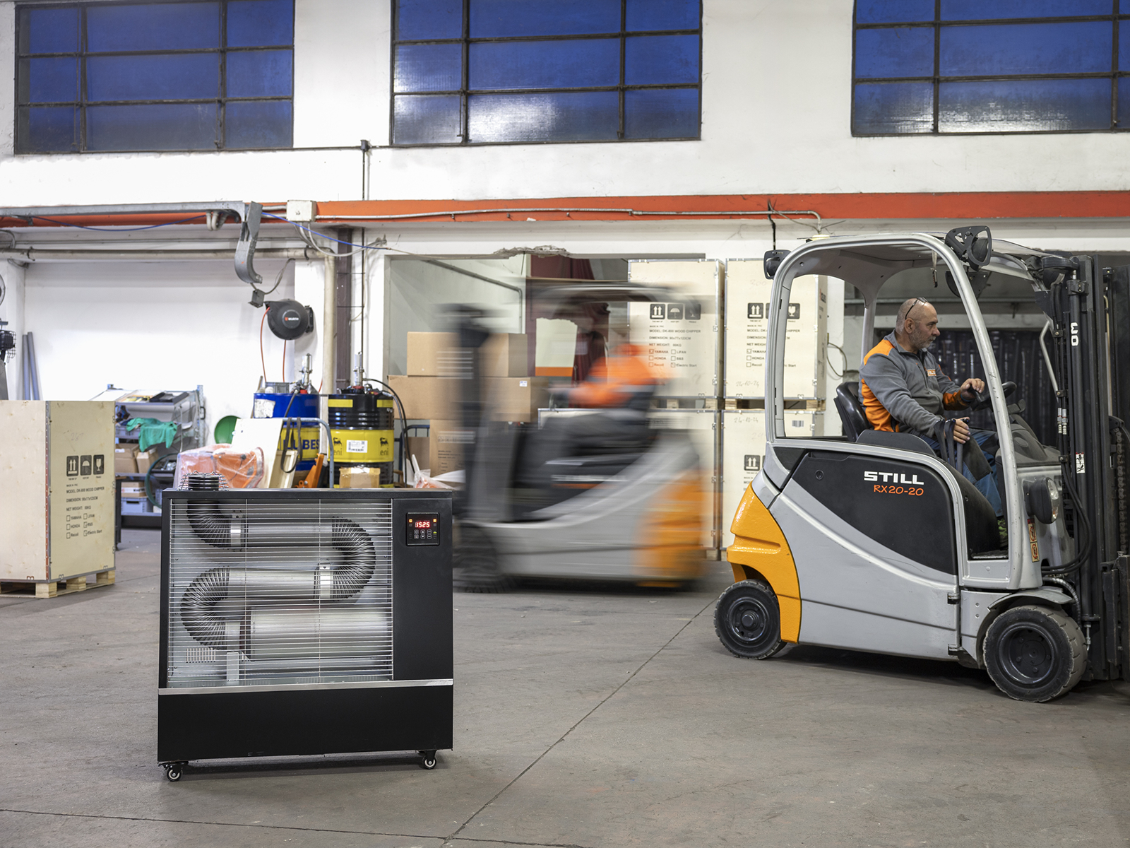 Innovative heating system for ventilated closed spaces (mechanical workshops, commercial, industrial, agricultural areas, warehouses, gyms) and outdoors such as greenhouses, terraces, construction sites...