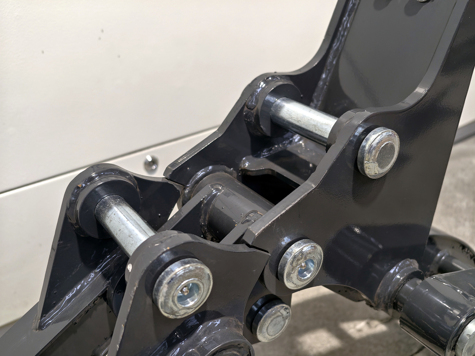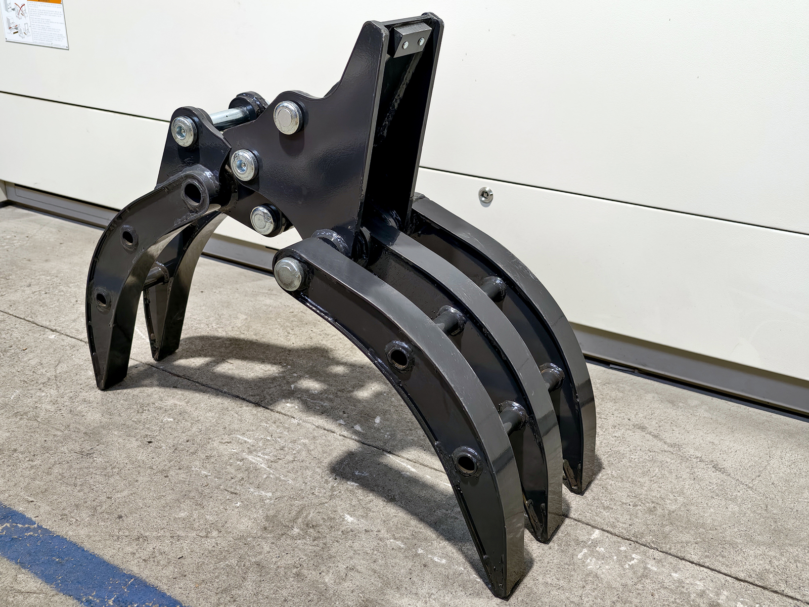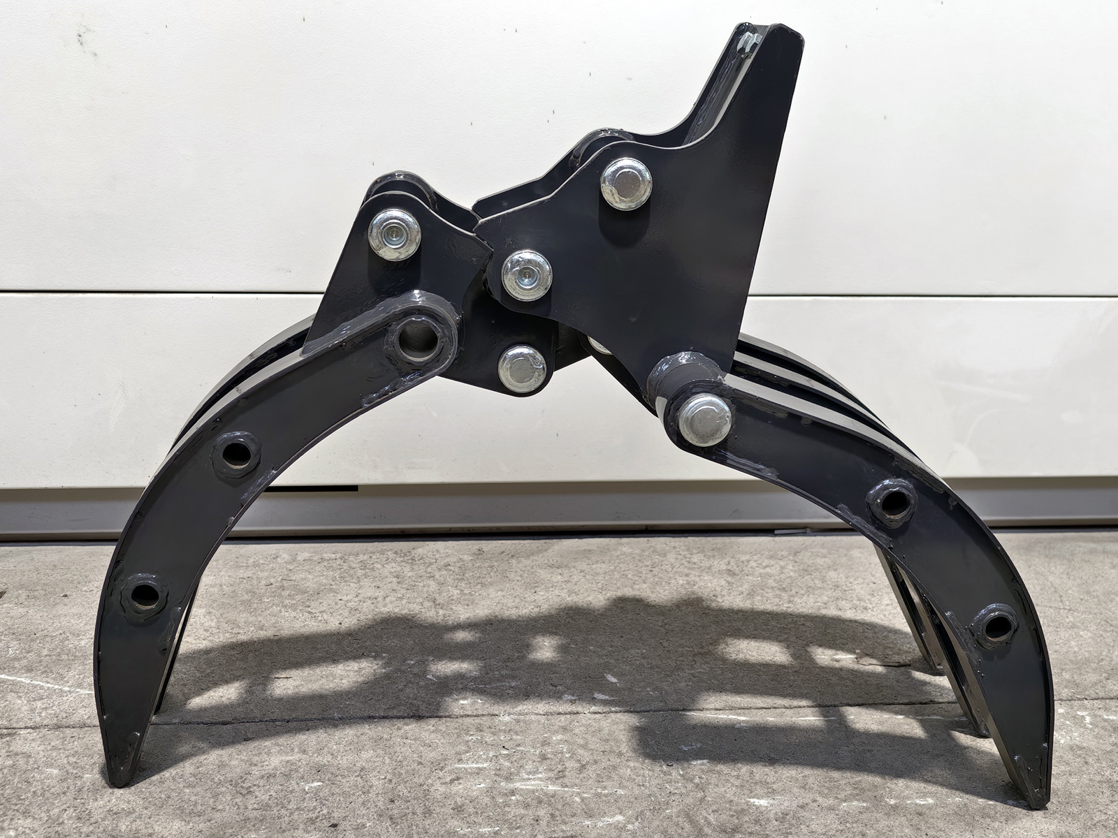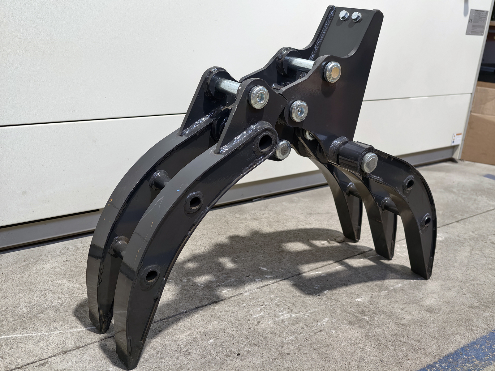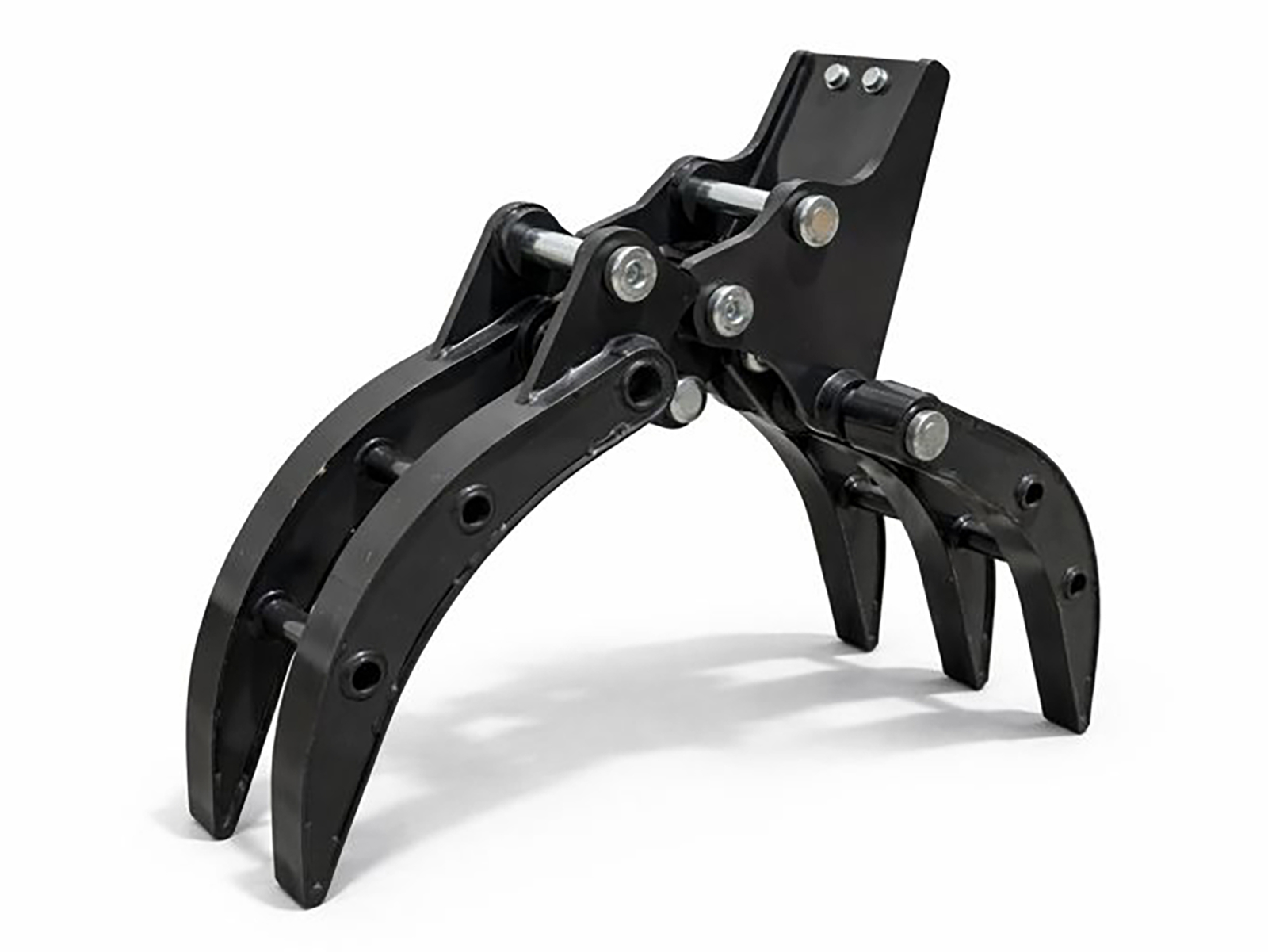 Grapple for S180 mini excavators, built from high-strength structural steel, featuring a single-actuator mechanism and shaped jaws for handling compact materials. The connection to the boom is made via two Ø30 mm pins with grease fittings, or through the S180 mechanical quick coupler. Engineered to ensure high torsional rigidity and resistance to the stresses generated during handling of irregular loads.