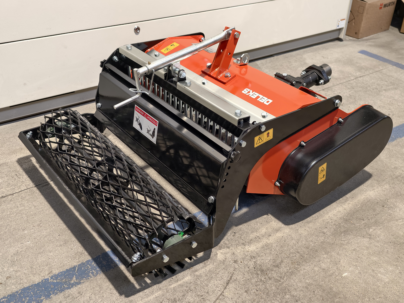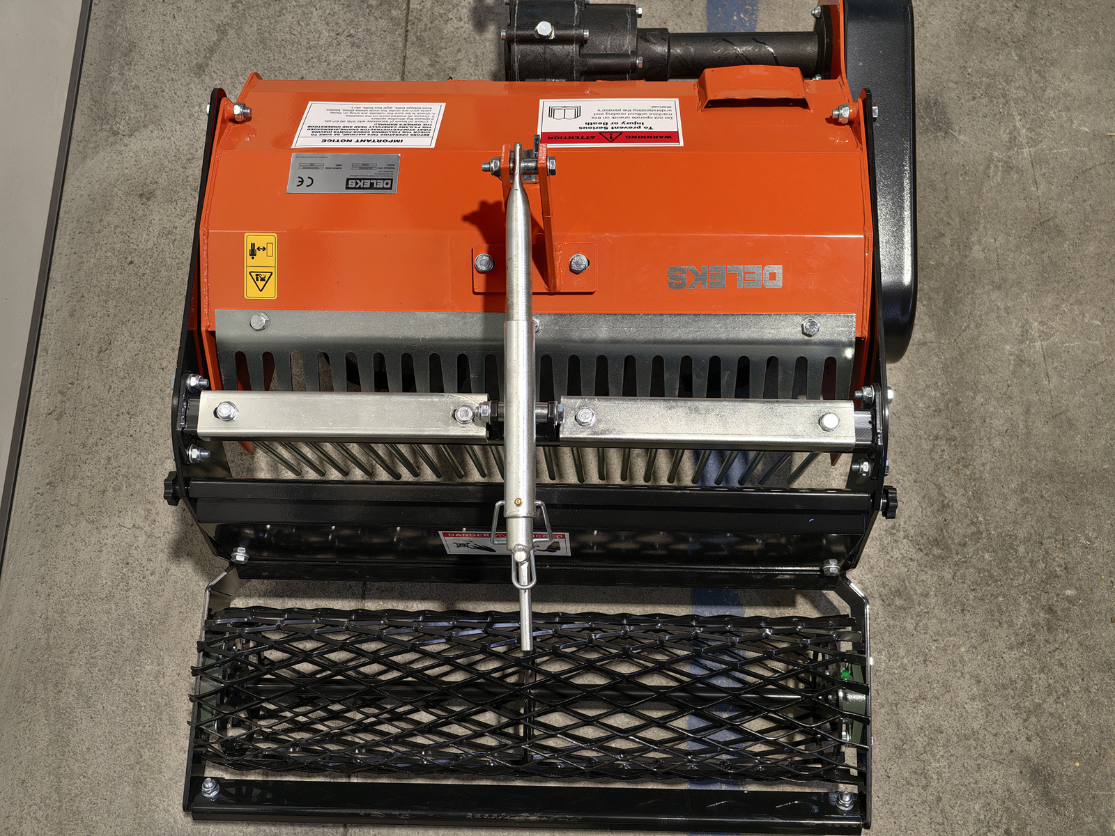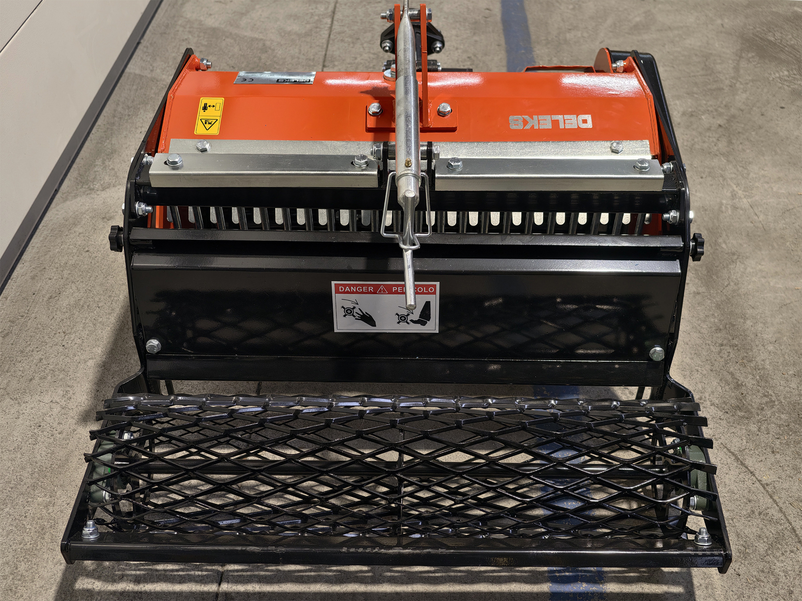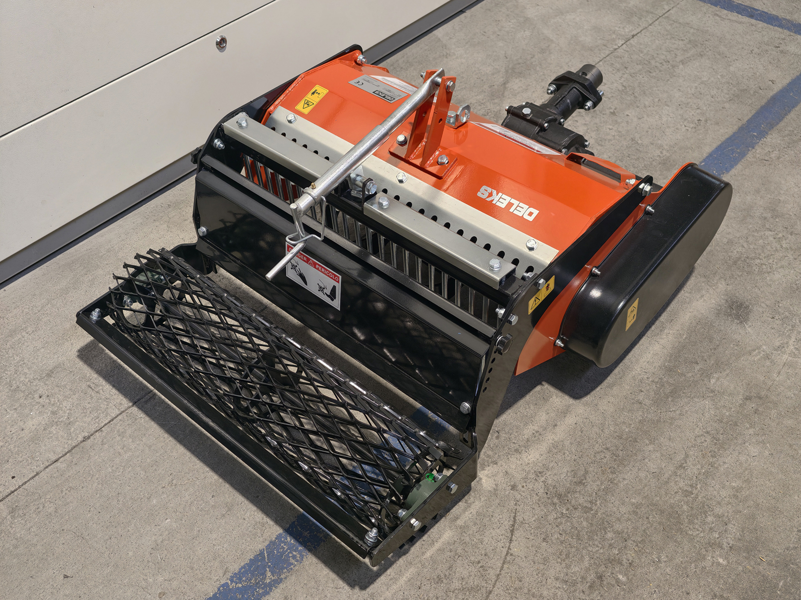 DELEKS® stone burier with mesh roller for walking tractor, compatible with BCS, Ferrari and Pasquali walking tractors, supplied with male quick hitch.