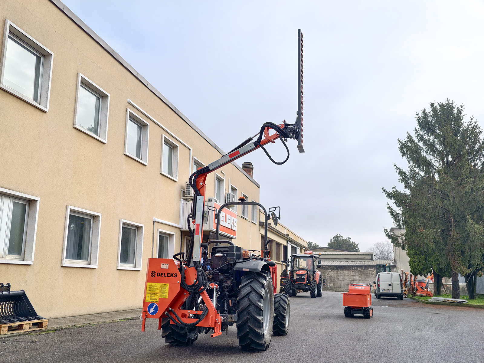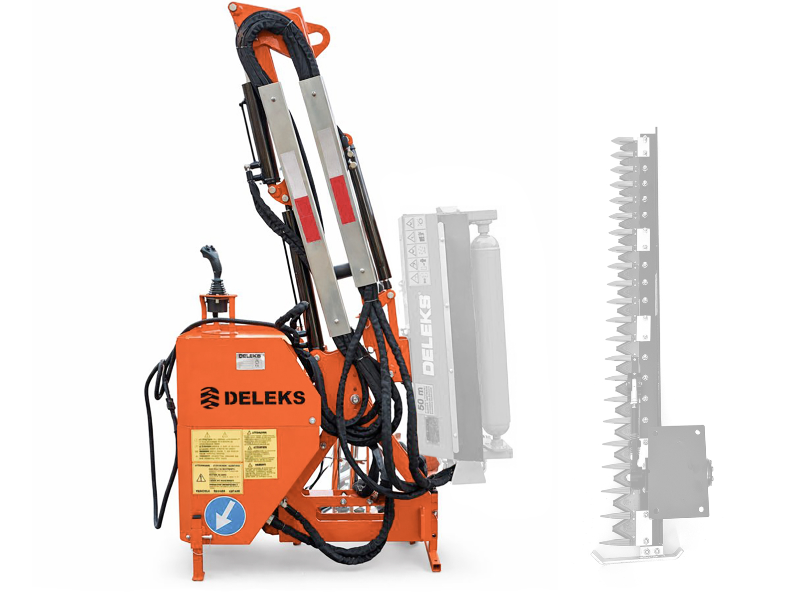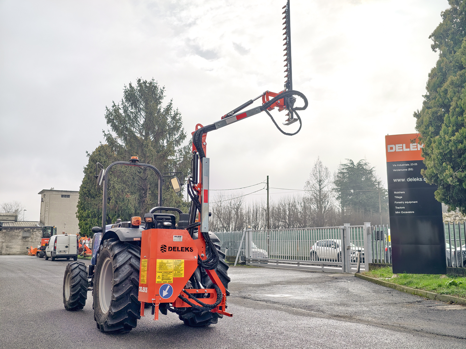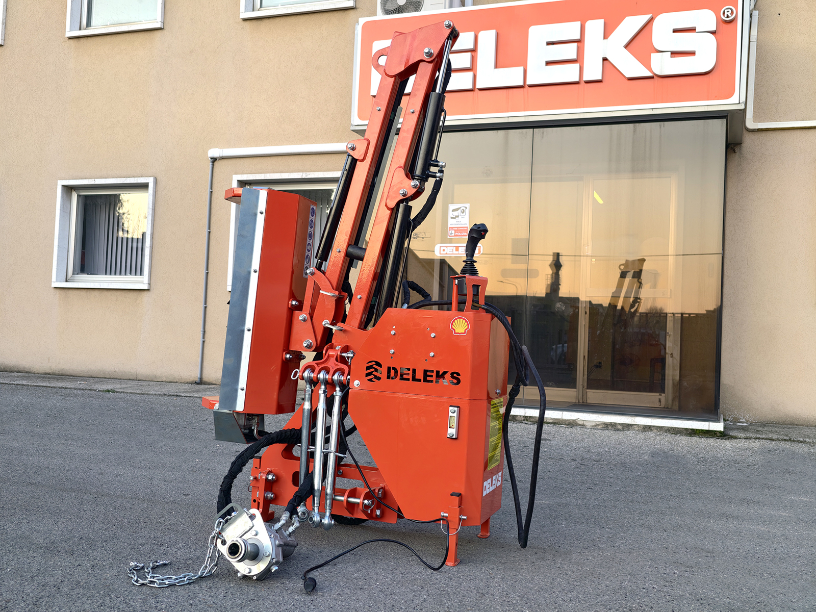 CLOSEHydraulic mounted Hedgecutter for tractor DELEKS® AIRONE, multiple hedge and grass verge rear arm cutter compatible with tractors with 3-point hitch Cat. 1, designed for flail mower heads of 60–80–100 cm or hedge cutter bars of 130–160–180 cm. Control joystick and PTO pump included.