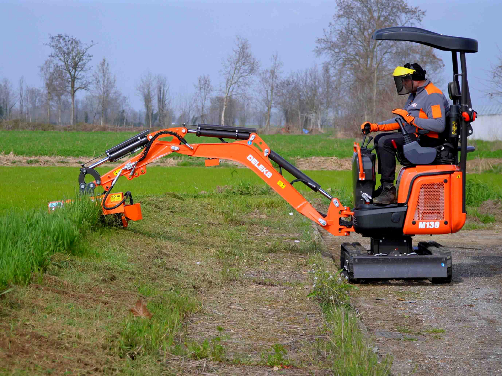 DELEKS® M130 mini excavator (1.3 ton) equipped with a 3-cylinder Kubota D722 engine, the only machine in this weight class capable of operating a mulcher head without requiring any modifications to the hydraulic system.