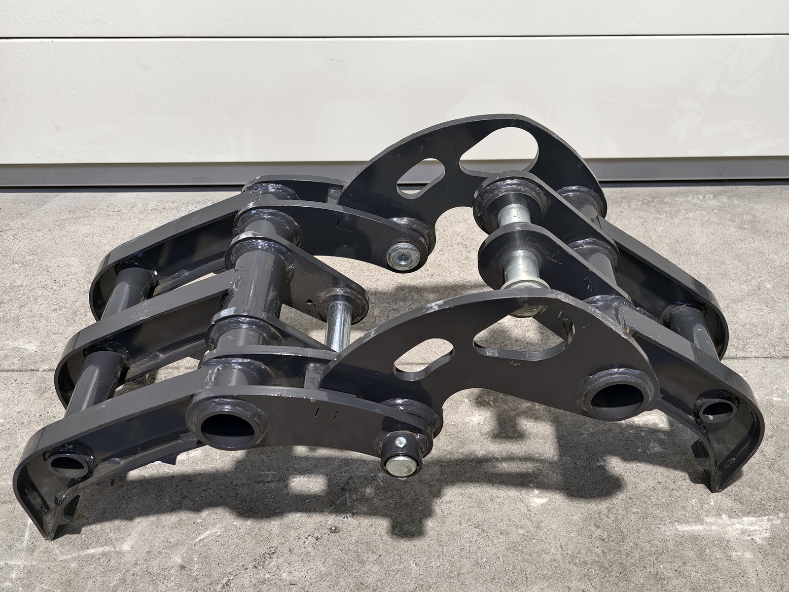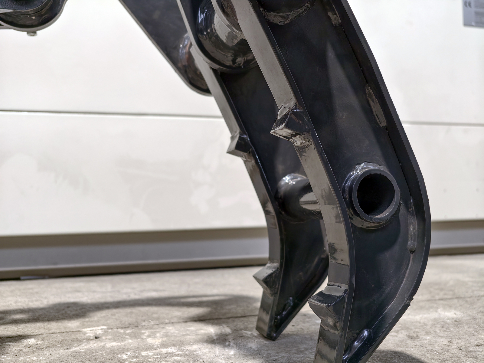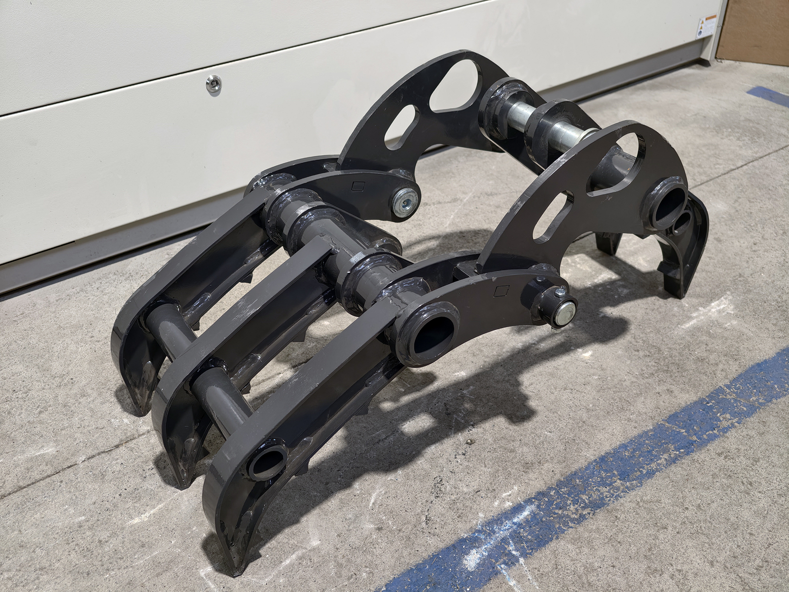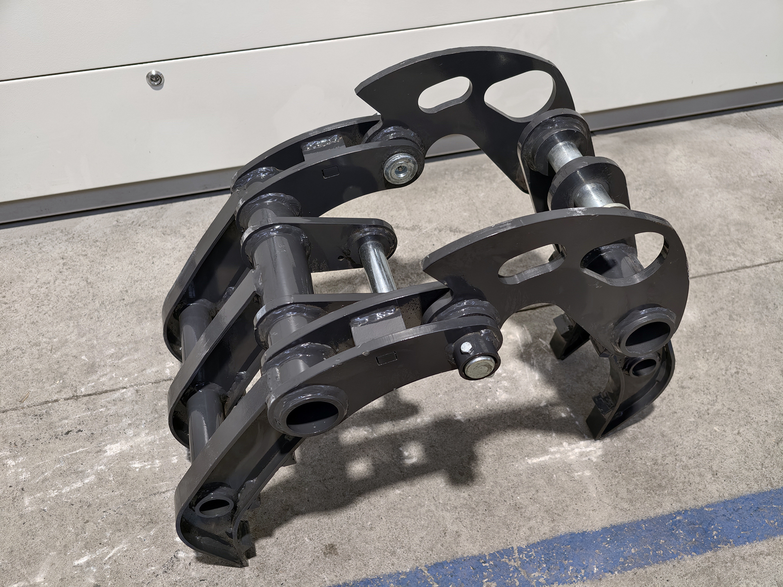 Grapple for S280 mini excavators, built from high-strength structural steel, featuring a single-actuator mechanism and shaped jaws for handling compact materials. The connection to the boom is made via two Ø35 mm pins with grease fittings, or through the S280 mechanical quick coupler. Engineered to ensure high torsional rigidity and resistance to the stresses generated during handling of irregular loads.