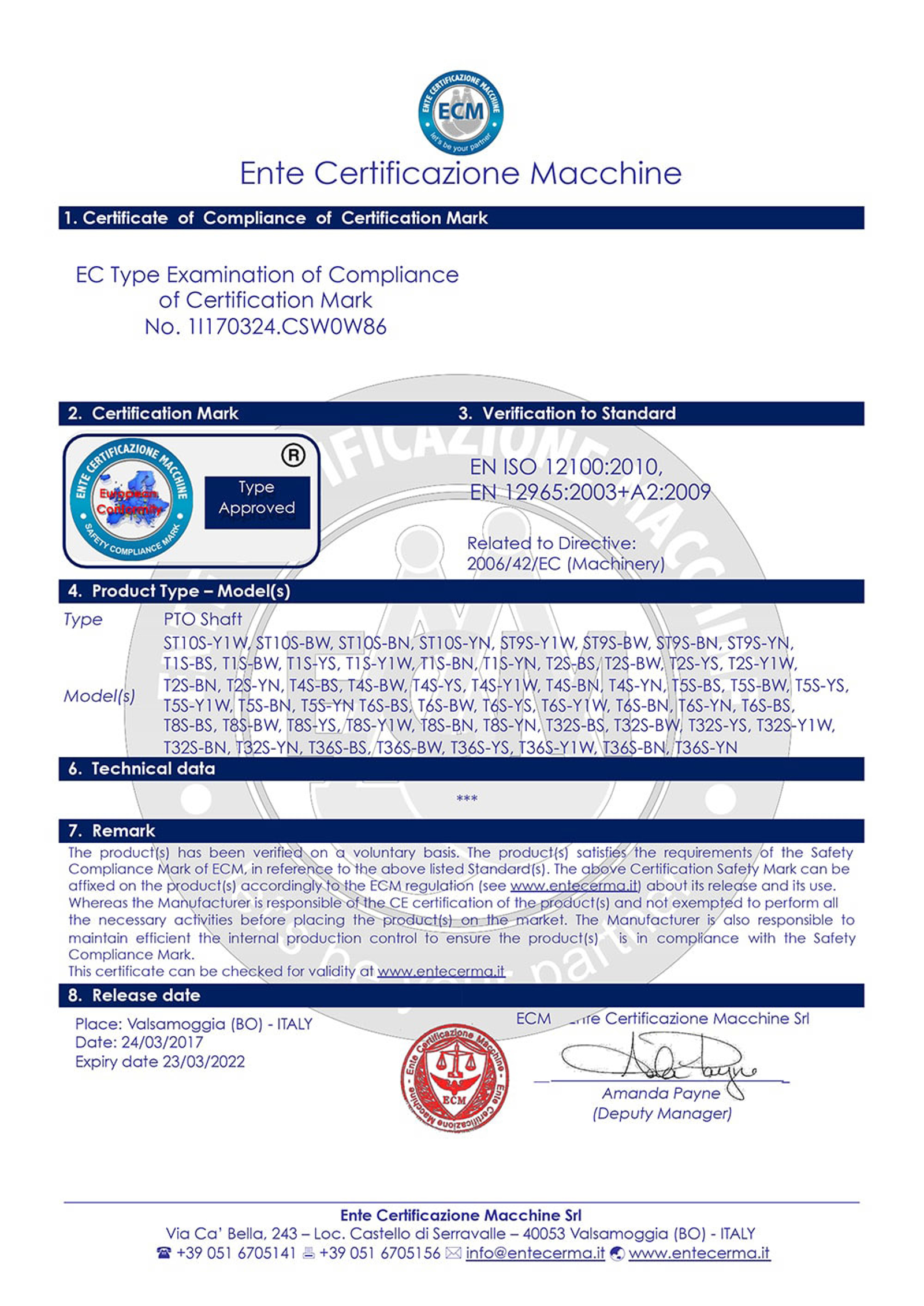 Certification Mark by ECM Ente Certificazione Macchine (Modena - Italy)