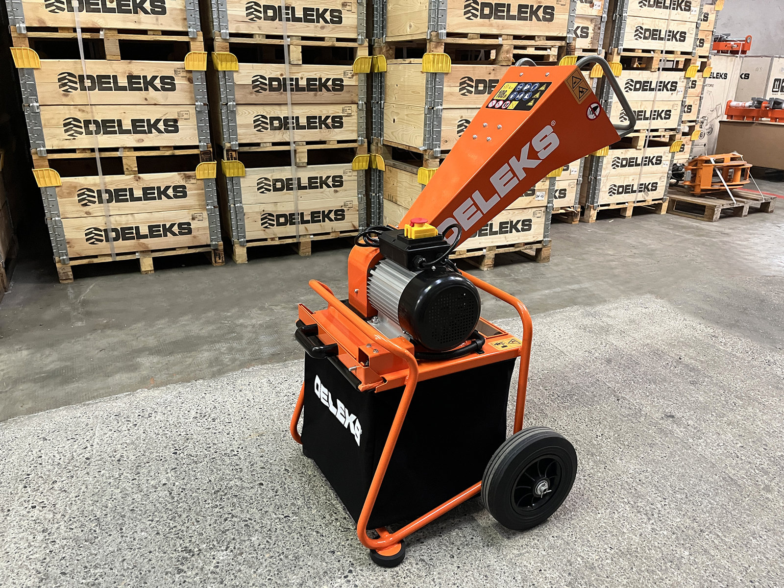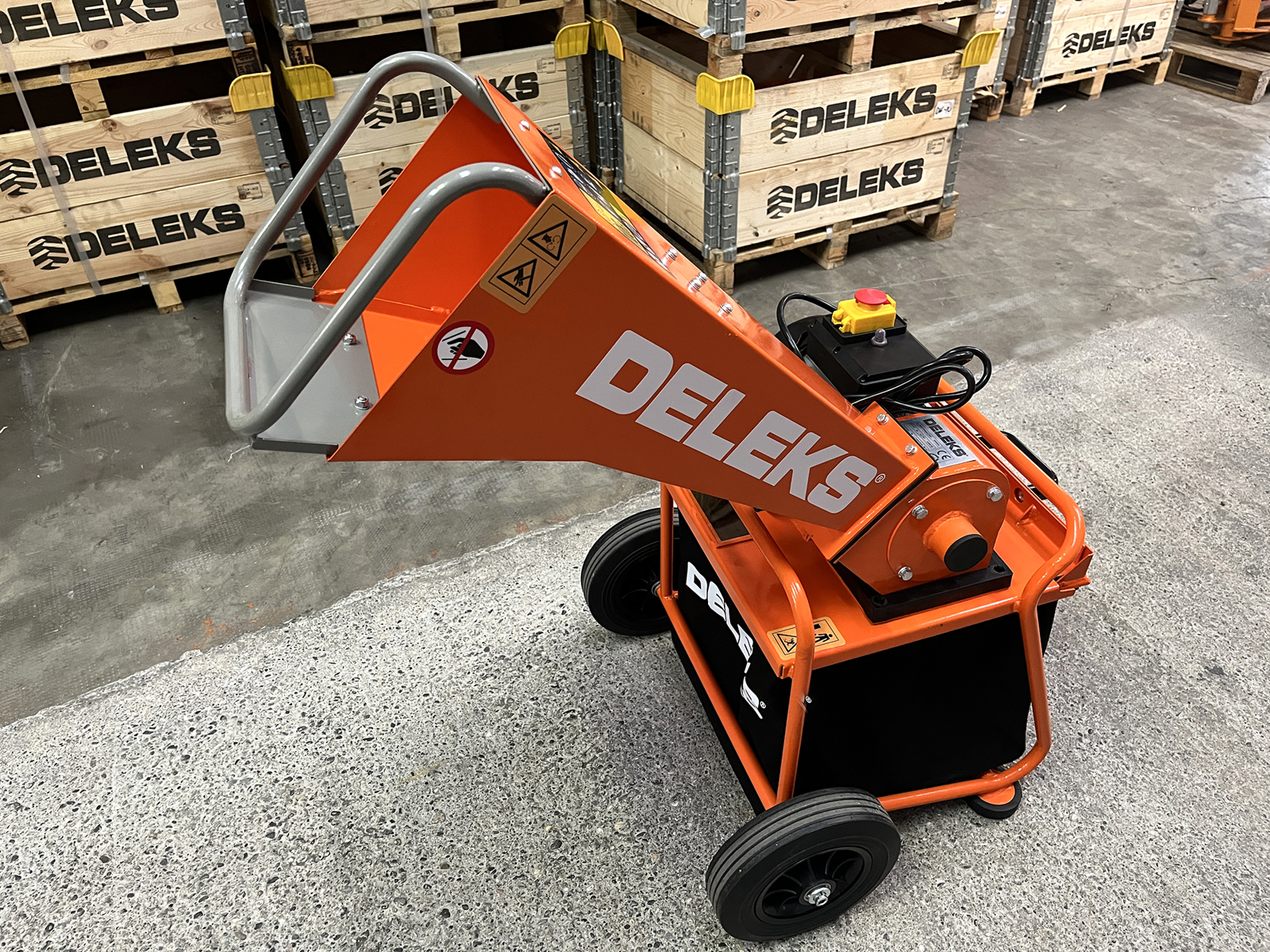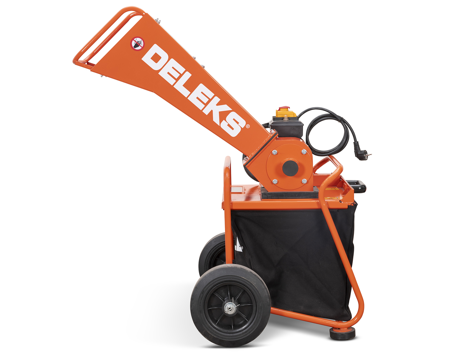CHIUDIBiotrituratore elettrico compatto DELEKS® DK-300 ES con motore elettrico da 2,8 kW alimentato a 220V con spina Schuko standard, progettato per la cippatura di rami e residui di potatura in ambito domestico e semi-professionale.