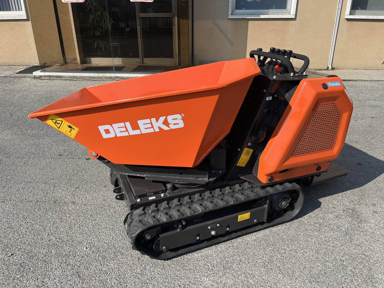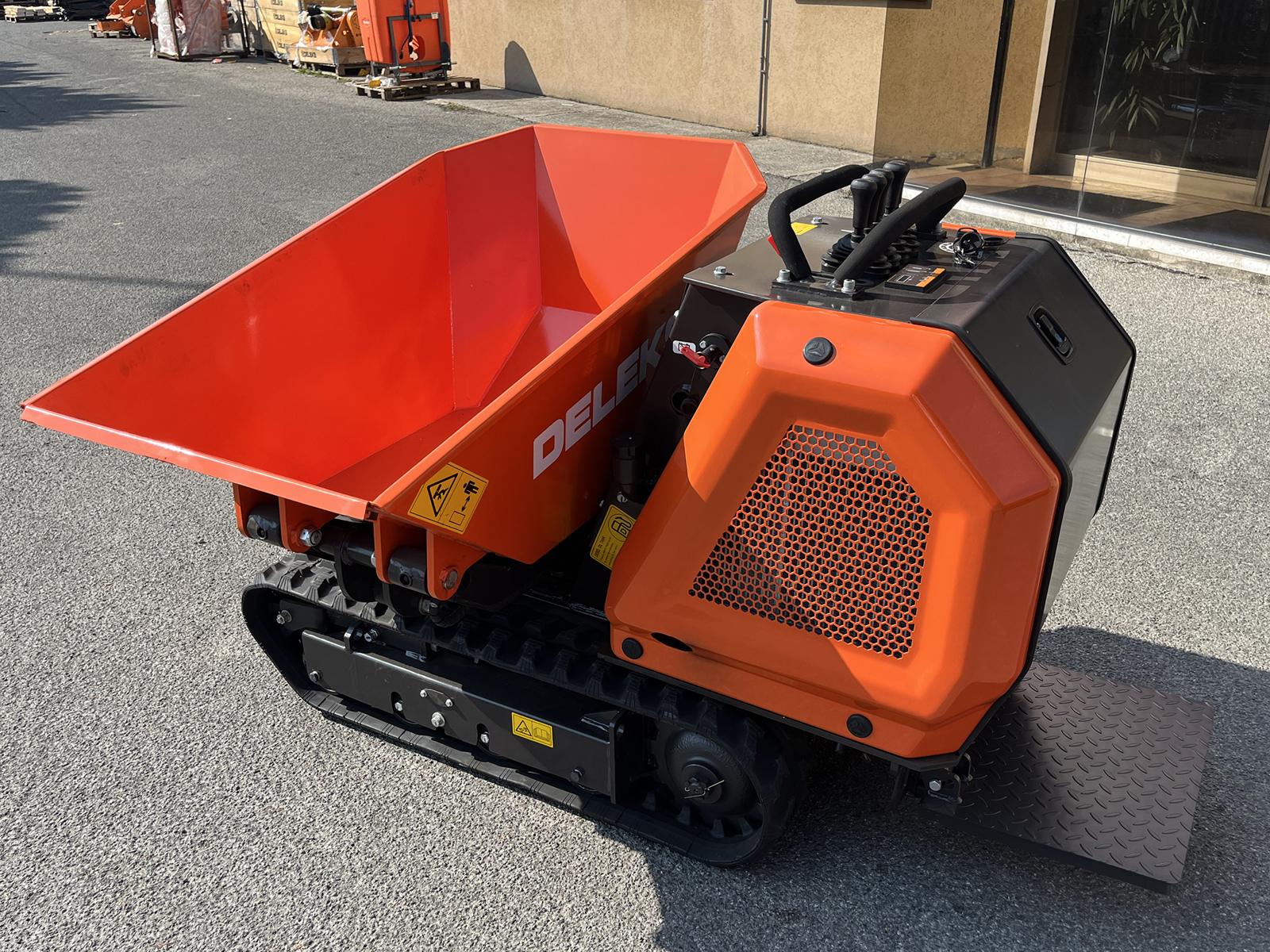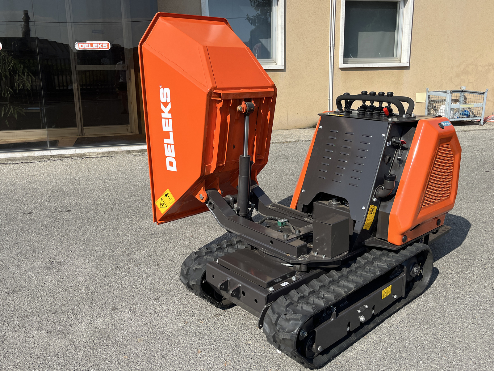 DELEKS® M8000R-KUBOTA Minidumper cingolato autocaricante, benna con scarico trilaterale su 180° con sollevamento e rotazione idraulici, valvola di blocco su rotazione, trasmissione idrostatica, pedana operatore, motore Kubota, avviamento elettrico.