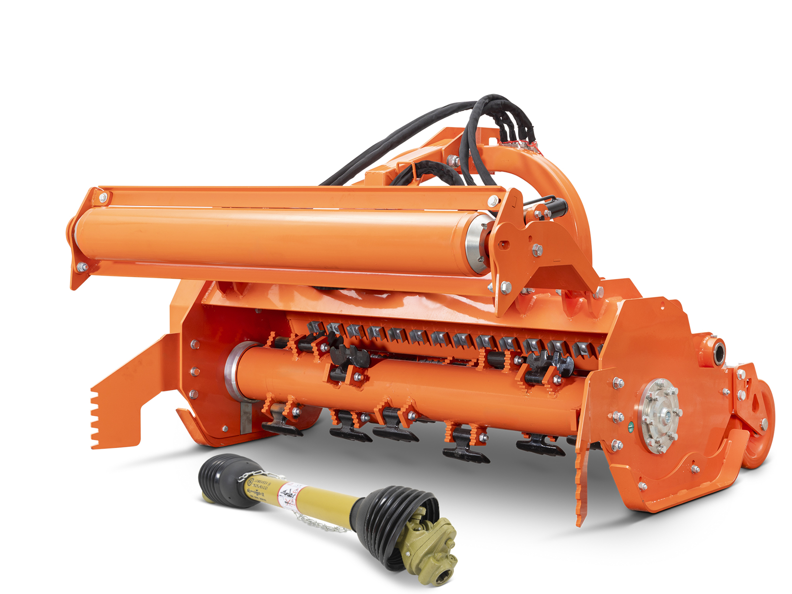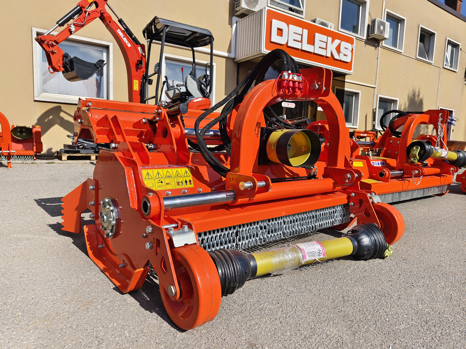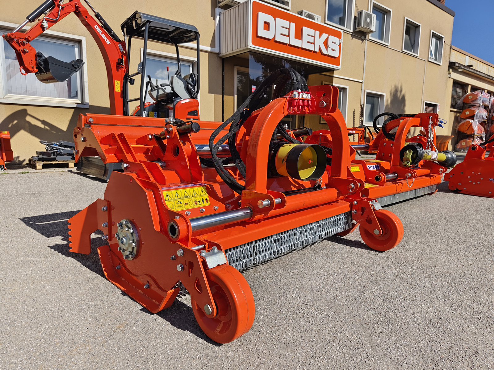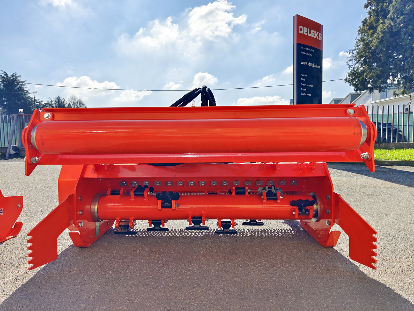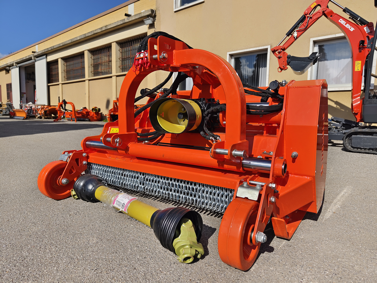CHIUDITrinciasarmenti serie pesante DELEKS® GORILLA-150 ideale per la trinciatura su residui di potatura di vigneto, frutteto, oliveto e materiale legnoso boschivo fino a Ø 15 cm. Spostamento idraulico e cardano con bullone di sicurezza.