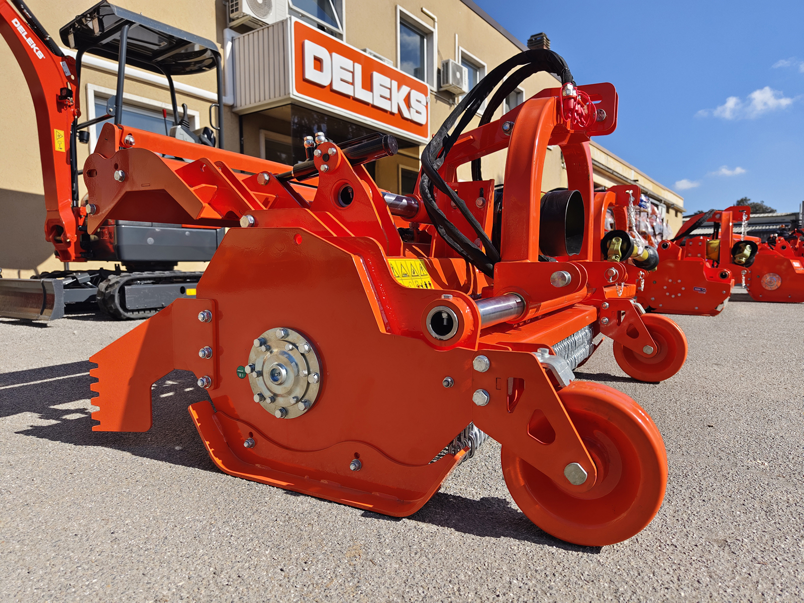 Trinciasarmenti serie pesante DELEKS® GORILLA-150 ideale per la trinciatura su residui di potatura di vigneto, frutteto, oliveto e materiale legnoso boschivo fino a Ø 15 cm. Spostamento idraulico e cardano con bullone di sicurezza.