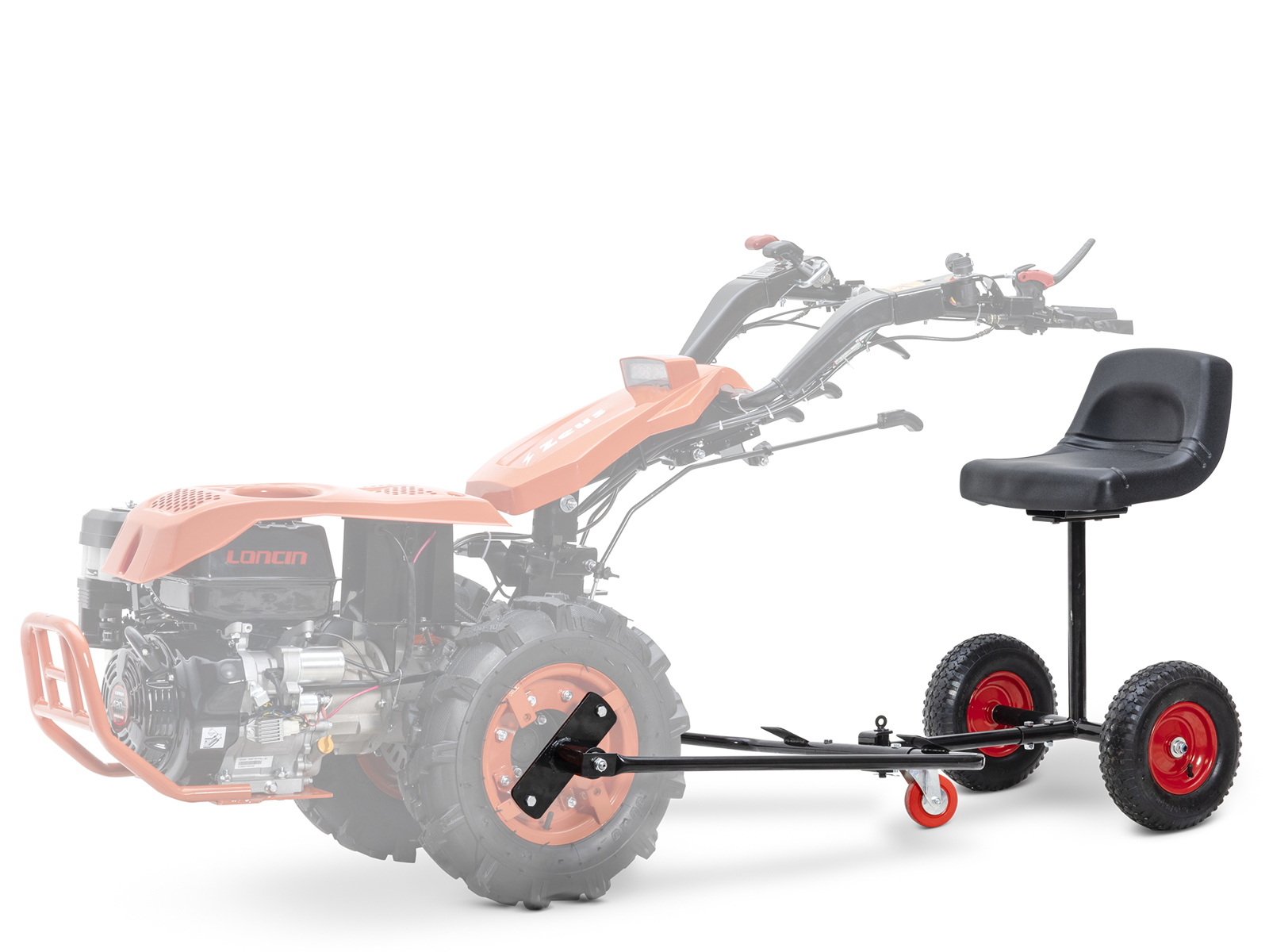 DELEKS® Carrello Sulky per motocoltivatore Zeus. Telaio con 2 ruote e sedile, da utilizzare con il motocoltivatore in assetto frontale con trinciatrice o spazzaneve.