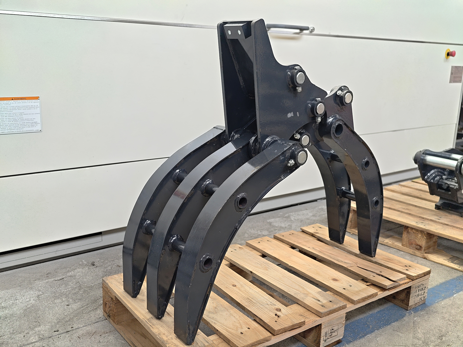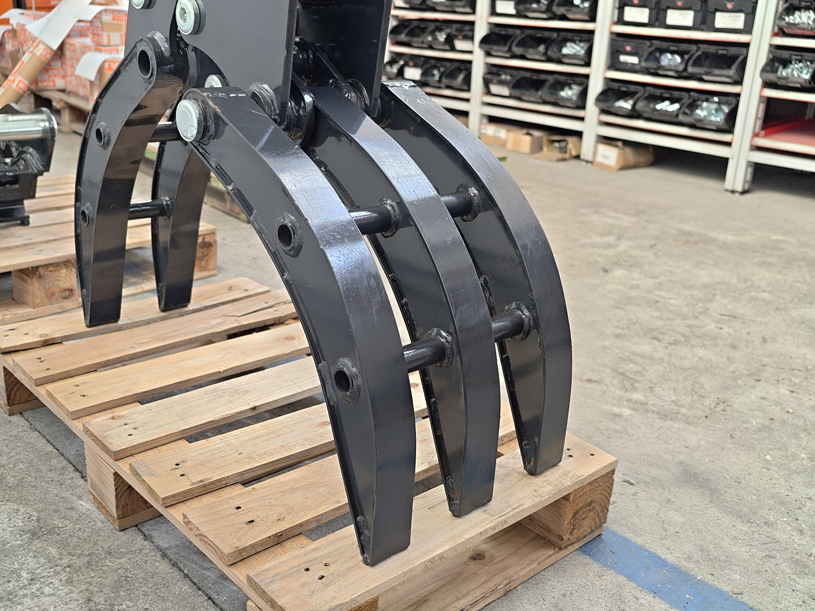 Pinza per miniescavatori S180, costruita in acciaio strutturale ad alta resistenza, con cinematismo a singolo attuatore e ganasce sagomate per la presa di materiali compatti. Il collegamento al braccio avviene tramite 2 perni Ø30 mm con ingrassatore oppure mediante attacco rapido meccanico S180. Progettata per garantire elevata rigidità torsionale e resistenza alle sollecitazioni derivanti dalla movimentazione di carichi irregolari.