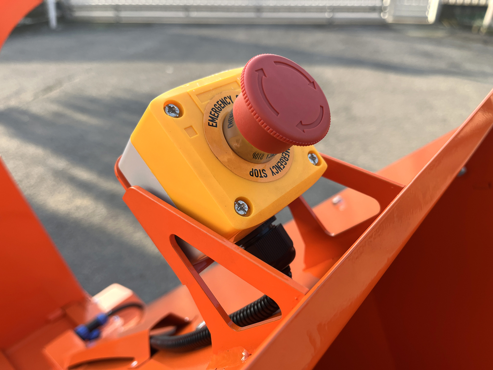 La macchina è dotata di pulsante di emergenza a fungo che arresta immediatamente il funzionamento spegnendo il motore in caso di necessità. Un sensore di sicurezza impedisce l’avviamento del motore del biotrituratore se la tramoggia di scarico è smontata. La tramoggia di alimentazione è inoltre richiudibile, evitando che il sistema di taglio rimanga esposto quando la macchina è parcheggiata o durante il trasporto.