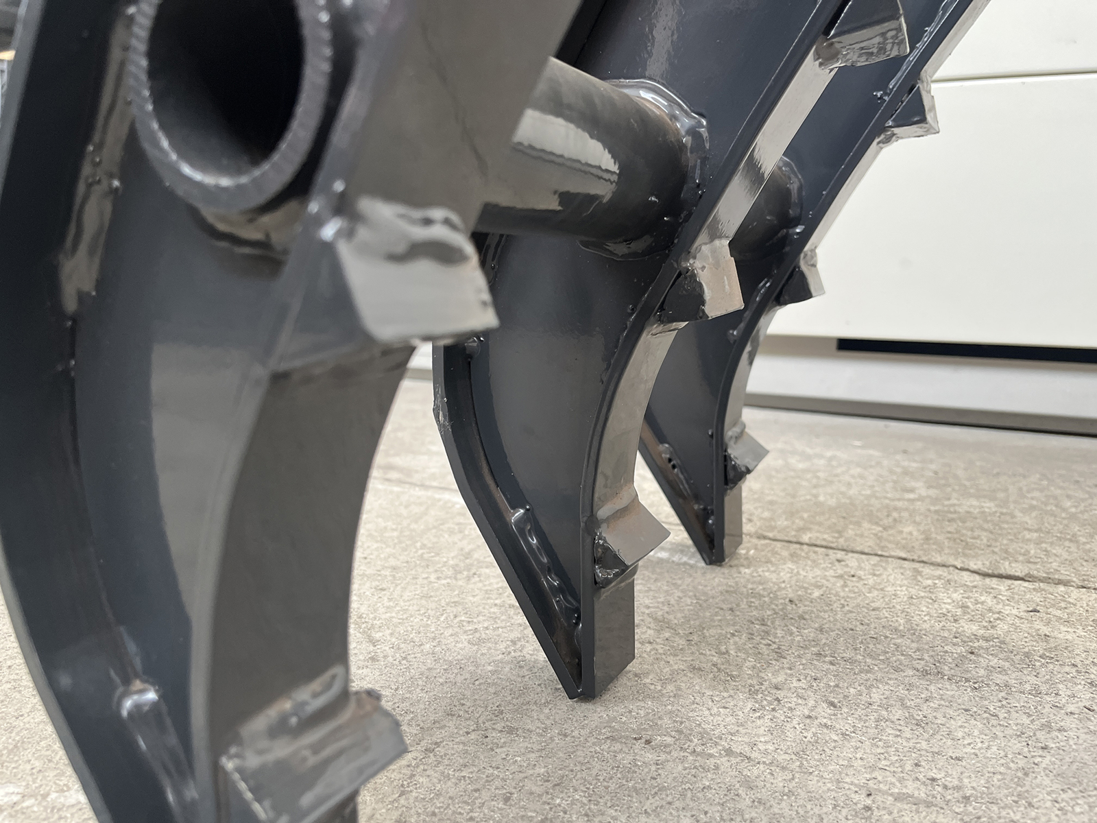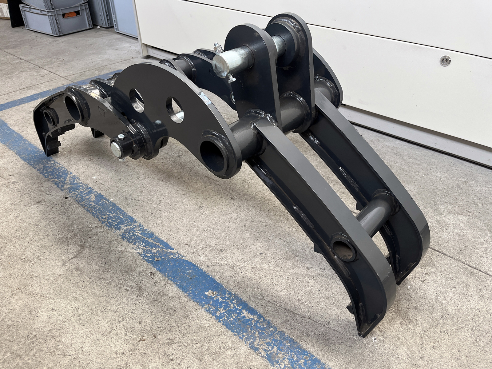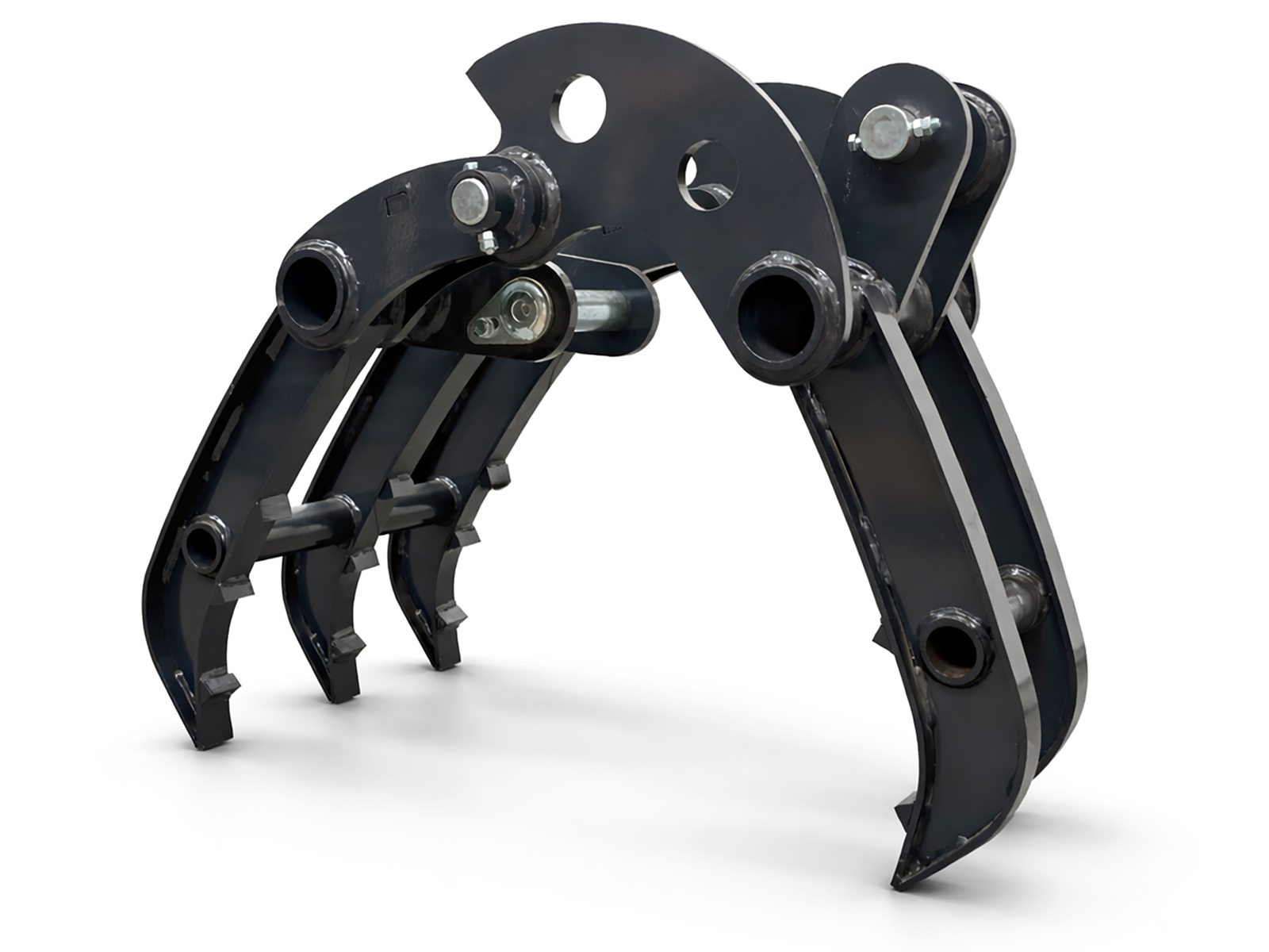 Pinza per miniescavatori S380, costruita in acciaio strutturale ad alta resistenza, con cinematismo a singolo attuatore e ganasce sagomate per la presa di materiali compatti. Il collegamento al braccio avviene tramite 2 perni Ø40 mm con ingrassatore oppure mediante attacco rapido meccanico S380. Progettata per garantire elevata rigidità torsionale e resistenza alle sollecitazioni derivanti dalla movimentazione di carichi irregolari.