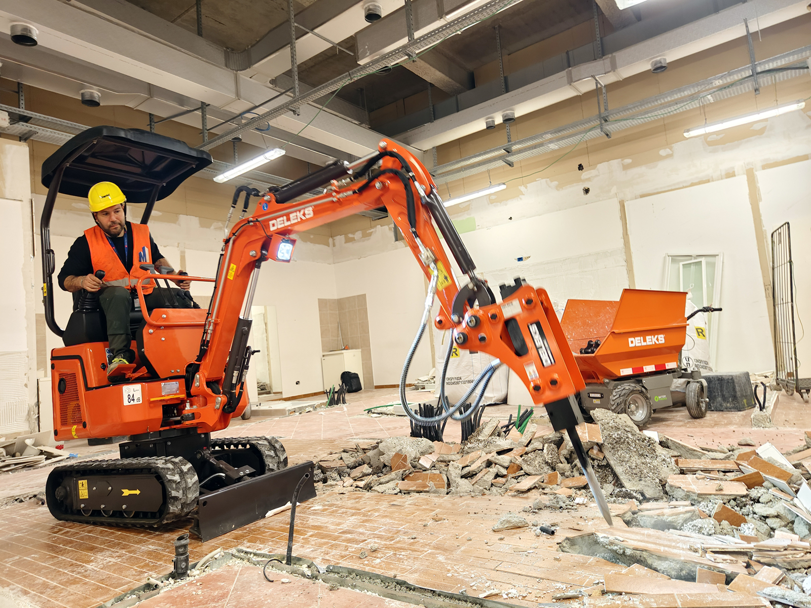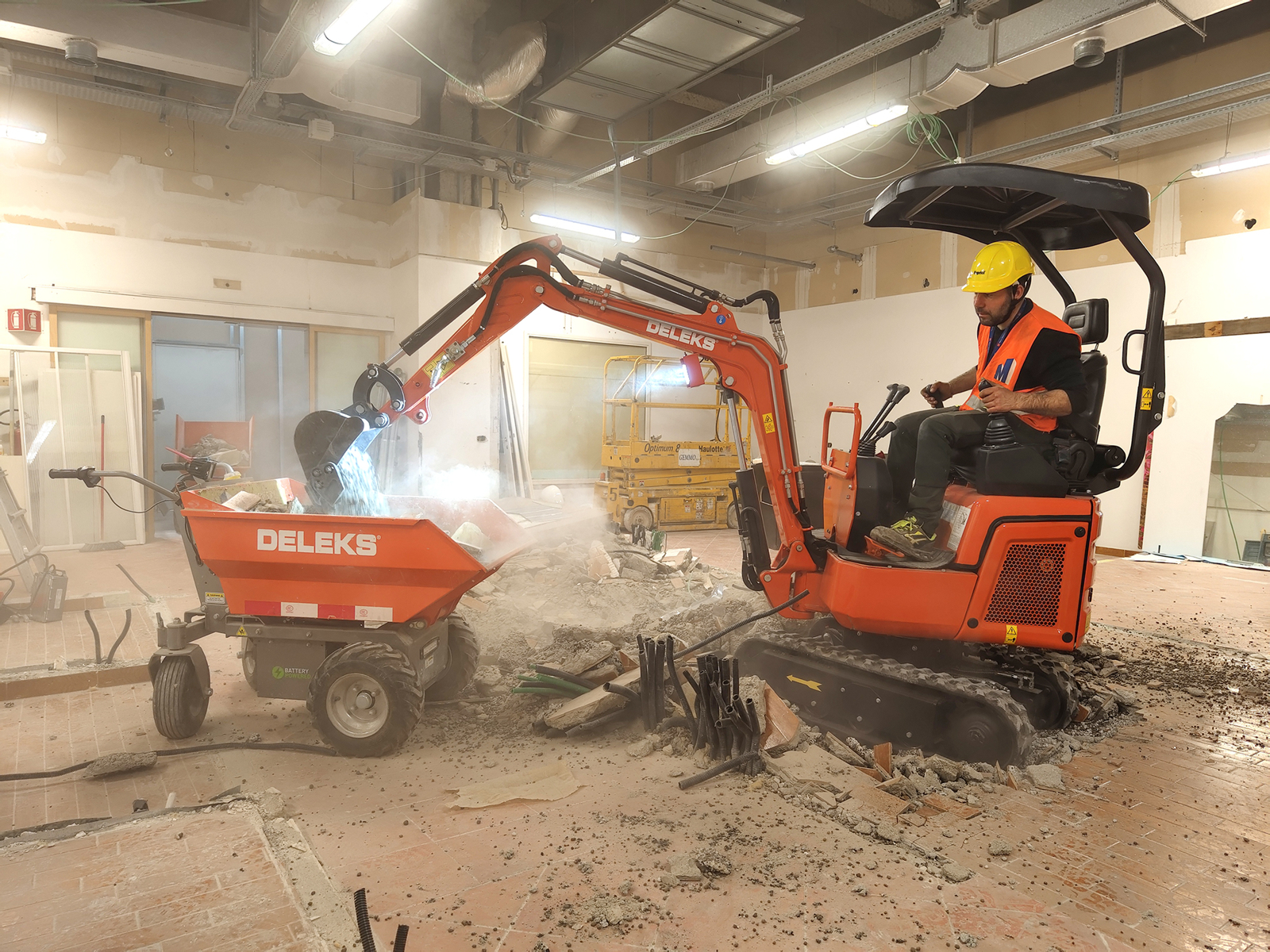 Il DELEKS® E110, allestito con martello demolitore DELEKS 350L e benna standard e supportato da carriole 100% elettriche DELEKS, ha permesso di eseguire demolizione e movimentazione dei materiali in totale sicurezza, senza emissioni e con livelli di rumorosità ridotti.